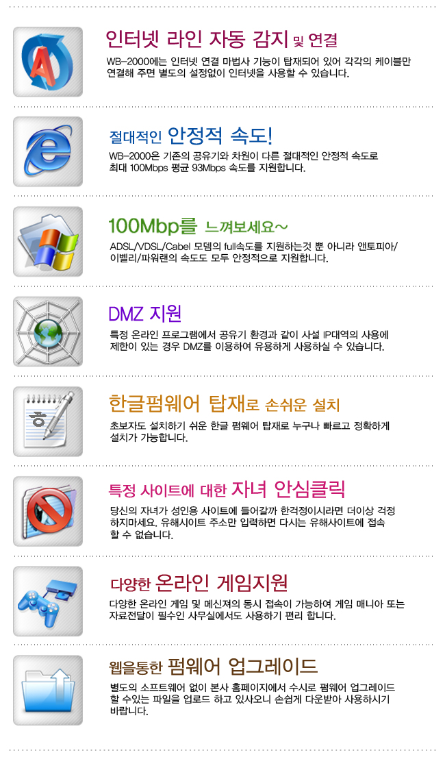 ADSL/VDSL/Cable ¸ðµ©ÀÇ full¼Óµµ¸¦ Áö¿øÇÏ´Â °Í »Ó¸¸ ¾Æ´Ï¶ó ¿£ÅäÇǾÆ/À̺§¸®/ ÆÄ¿ö·£ÀÇ ¼Óµµµµ ¸ðµÎ ¾ÈÁ¤ÀûÀ¸·Î Áö¿øÇÕ´Ï´Ù.